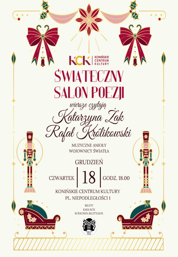 Dwoje wspaniałych aktorów przeczyta poezje o tematyce bożonarodzeniowej. W Salonie Poezji i Literatury Anny Dymnej wystąpią Katarzyna Żak i Rafał Królikowski. Będzie to wydanie świąteczne i rodzinne, dlatego do Konińskiego Centrum Kultury zapraszamy dzieci, rodziców, dziadków i wszystkich im bliskich. Wydarzenie odbędzie się 18 listopada na Dużej Scenie przy pl. Niepodległości 1. Będzie Wigilia – uśmiechną się ludzie!