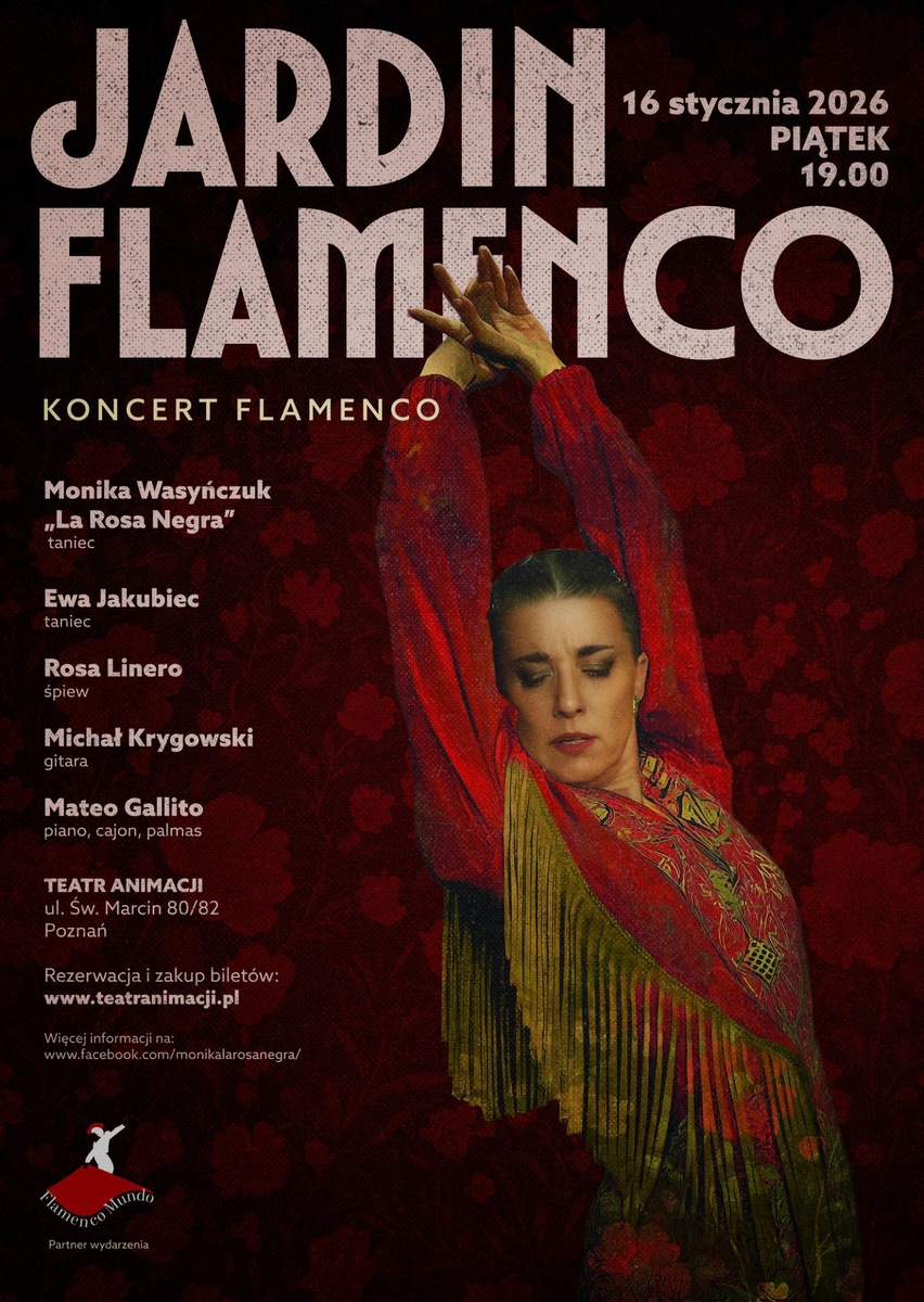 Jardín Flamenco to autorski projekt Moniki Wasyńczuk „La Rosa Negra”, do którego tancerka zaprasza swoich przyjaciół – artystów flamenco z Polski i Hiszpanii – by wspólnie tworzyć muzyczno-taneczny spektakl. Każdy koncert jest spotkaniem pełnym pasji – miejscem, gdzie muzyka, śpiew i taniec tworzą żywą, pulsującą opowieść.
