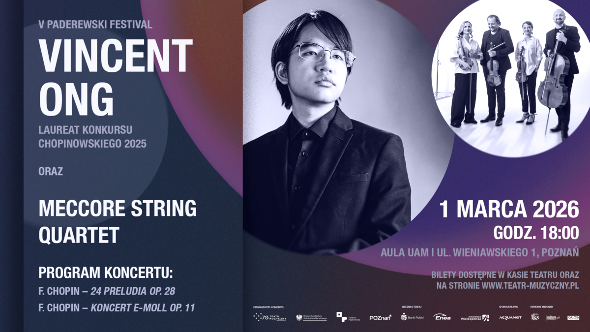 Wiosenny koncert Vincenta Onga to wyjątkowa okazja, aby poznańska publiczność usłyszała na żywo laureata jednego z najważniejszych konkursów pianistycznych na świecie. Jest to także zapowiedź V Paderewski Festival, organizowanego w dniach 6-11 listopada 2026 r. przez Teatr Muzyczny w Poznaniu i Bona Fide. Stowarzyszenie Wielkopolan.