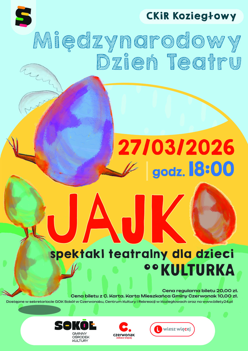 Gminny Ośrodek Kultury Sokół zaprasza na spektakl teatralny dla dzieci pt. Jajko, który odbędzie się w ramach obchodów Międzynarodowego Dnia Teatru.