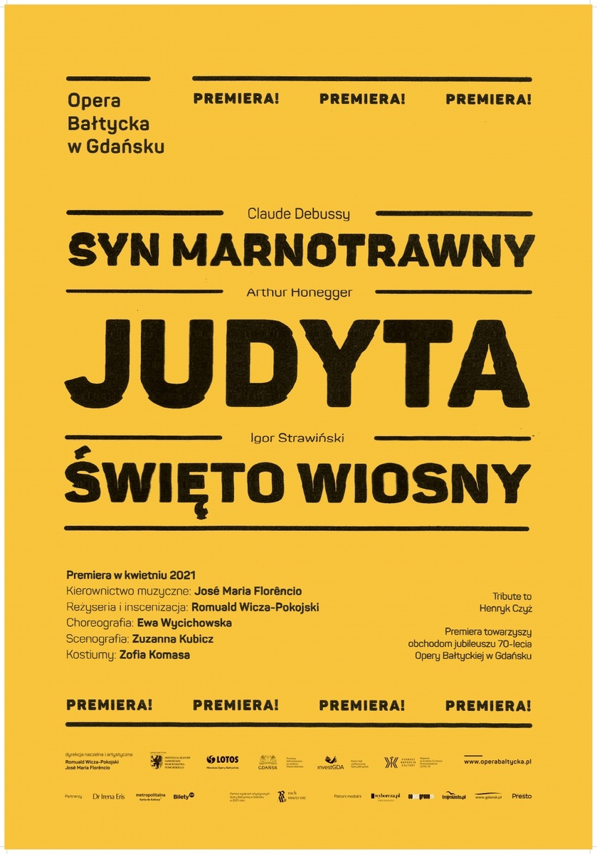 Wychodząc z założenia, że opera to przede wszystkim przeżycie duchowe, z okazji 70-lecia istnienia pragniemy przedstawić naszej publiczności przegląd estetyk i tematów, których zróżnicowanie pozwoli pokazać kunszt artystyczny wszystkich zespołów Opery Bałtyckiej. Od starotestamentowej historii o Judycie przez pogańskie Święto wiosny po przypowieść o synu marnotrawnym – muzyka Arthura Honeggera, Igora Strawińskiego i Claude’a Debussy’ego nawiązuje do literackich pierwowzorów, uwypuklając niejednoznaczność poruszanej w nich problematyki.