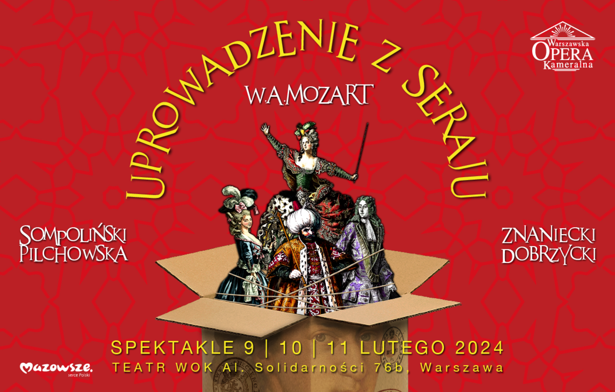 Teatr Warszawskiej Opery Kameralnej Wolfgang Amadeus Mozart UPROWADZENIE Z SERAJU Die Entführung aus dem Serail Singspiel w trzech aktach, w oryginalnej niemieckiej wersji językowej z dialogami w języku polskim Premiera | 1 czerwca 2023 Kompozytor | Wolfgang Amadeus Mozart Libretto | Johann Gottlieb Stephanie der Jüngere REALIZATORZY: Kierownictwo muzyczne/dyrygent | Marcin Sompoliński Inscenizacja i reżyseria | Michał Znaniecki Choreografia | Inga Pilchowska Scenografia, kostiumy i światła | Paweł Dobrzycki OBSADA: Konstanze – Joanna Moskowicz Belmonte – Aleksander Kunach Pedrillo – Bartosz Nowak Blonde – Katarzyna Drelich Osmin – Sebastian Marszałowicz Selim – Maciej Miecznikowski Tancerze:...