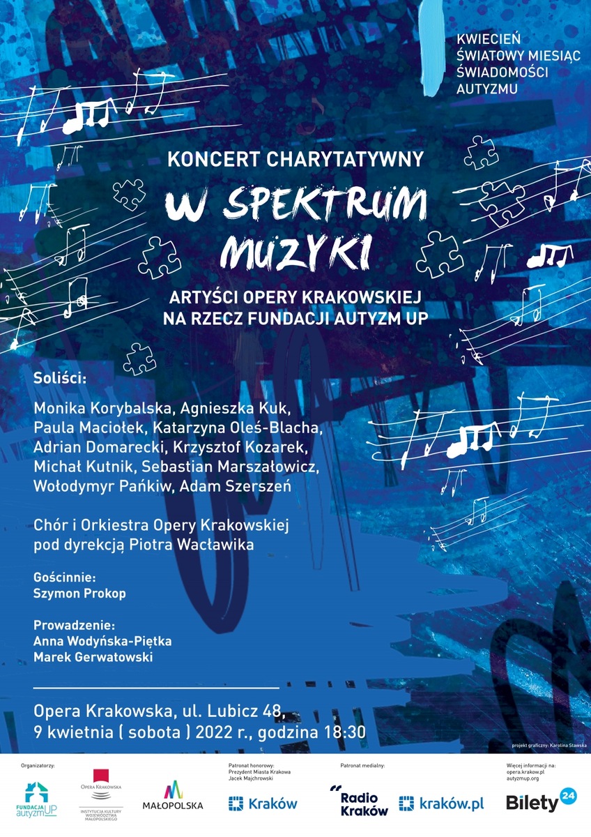 Koncert Charytatywny "W spektrum muzyki" Artyści Opery Krakowskiej na rzecz Fundacji Autyzm Up. Artyści Opery Krakowskiej po raz kolejny włączą się w działalność na rzecz szerzenia świadomości w temacie autyzmu. “Sukces wykreowanej i wyśpiewanej wspólnie z Fundacją Autyzm Up kampanii "Niezwykli sąsiedzi" owocuje jeszcze większym muzycznym projektem: koncertem charytatywnym “W spektrum muzyki”. - mówi Marek Gerwatowski, artysta Opery Krakowskiej, pomysłodawca obu dobroczynnych akcji.- “My, artyści i pracownicy Opery, chcemy się angażować w ważne inicjatywy. Im więcej mówi się o autyzmie, tym mniej ludzi przechodzi obok tego tematu obojętnie. Tworzy się przestrzeń do zrozumienia i akceptacji”. Do udziału w koncercie został zaproszony uzdolniony...