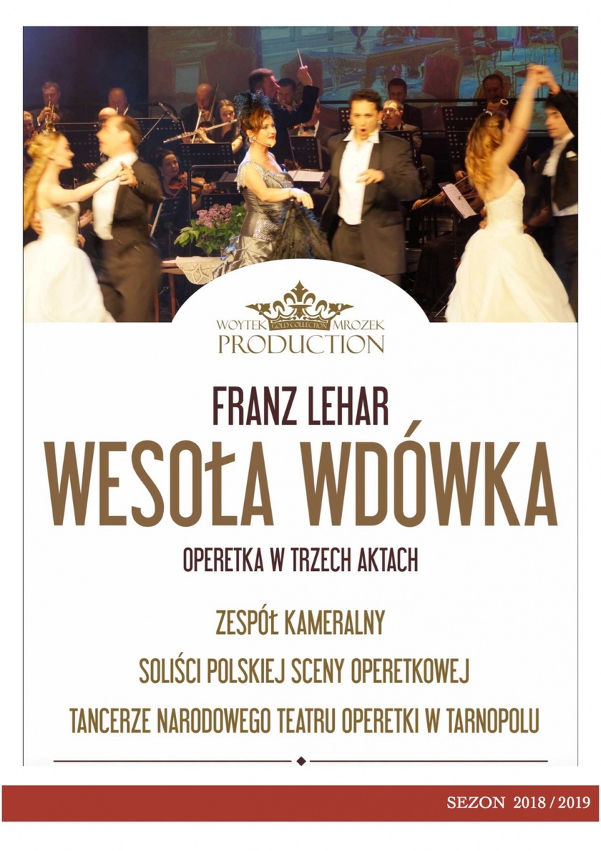 … „Wesoła Wdówka”… Najsłynniejsze sceniczne dzieło Franza Lehara… Operetka, której wszystkie arie i pieśni, to niezaprzeczalne światowe przeboje…Wiadomość o przyjeździe do Paryża, bogatej i pięknej wdowy po bankierze wstrząsa mieszańcami. Aby zatrzymać majątek w księstwie zostaje uknuta intryga, która zakłada wydanie za mąż Hanny Glawarii za rodaka… Jednak, nie wszystko biegnie po myśli spiskujących…Produkcja Wojciecha Mrozka z udziałem solistów i tancerzy Operetki Śląskiej, oraz solistów sceny krakowskiej, wrocławskiej i warszawskiej… Bogata scenografia, doskonałe kostiumy oraz zabawne libretto uzupełniają całość tego arcydzieła sztuki operetkowej. Przyjazne widowisko dostarcza kilku godzin rozrywki i przyjemności wszystkim melomanom… Wielbiciele muzyki Lehára będą mogli posłuchać jego pięknych melodii i bawić się licznymi perypetiami…”