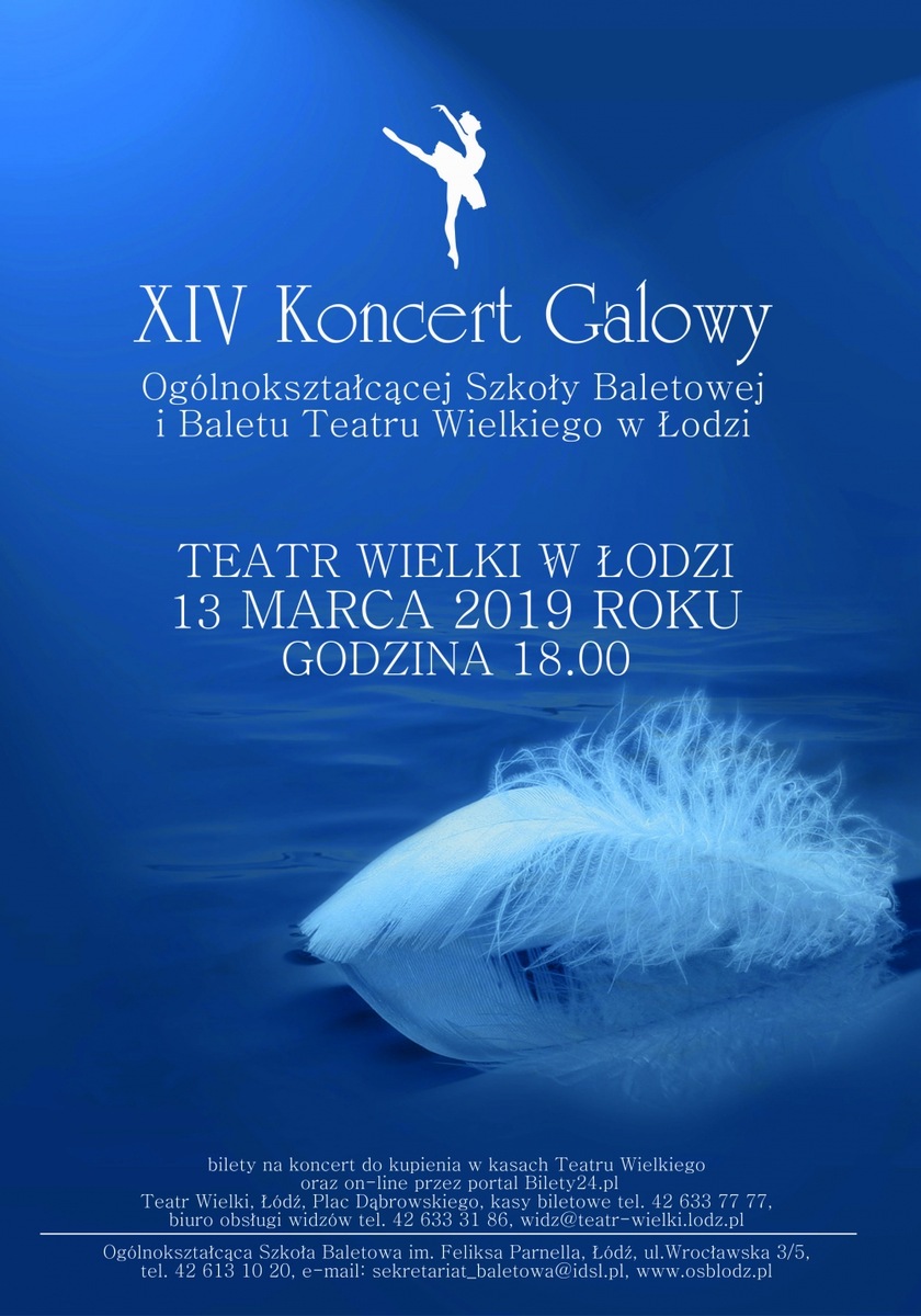 „XIV Koncert Galowy Ogólnokształcącej Szkoły Baletowej i Baletu Teatru Wielkiego w Łodzi” 13 marca 2019 roku, godzina 18.00 Teatr Wielki w Łodzi W programie koncertu: układy choreograficzne w technice tańca klasycznego, współczesnego, ludowego i charakterystycznego. Zobaczymy prezentacje uczniów klas edukacji wczesnoszkolnej prowadzonych od sześciu lat w formie eksperymentu pedagogicznego, uczniów klas I-IX szkoły baletowej, w tym wielu uczniów nagrodzonych stypendiami i nagrodami na międzynarodowych, ogólnopolskich konkursach baletowych oraz tancerzy baletu Teatru Wielkiego w Łodzi.*******