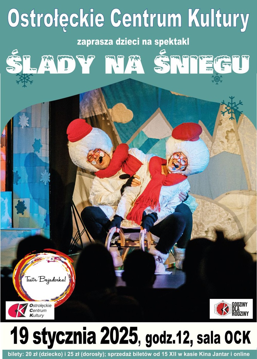 Zapraszamy na styczniowe Godziny dla Rodziny! Teatr Bajaderka zabiera nas w zimową podróż. Bałwanki Puch i Buch – najlepsi śnieżni przyjaciele – oprowadzą nas po Lodowej Krainie, gdzie pokażą nam, co się dzieje, gdy zmienia się pogoda. Bałwanki zaprezentują oryginalne zimowe zabawy, przeprowadzą prawdziwą bitwę na śnieżki, a nawet nauczą dzieci tańca bałwanków. Zabawom towarzyszyła będzie sama Pani Zima. A najważniejsze – poznamy odpowiedź na pytanie do kogo należą tajemnicze czarne ślady na śniegu i dokąd nas zaprowadzą. Sprzedaż biletów od 15 grudnia w cenie 20 zł (dziecko), 25 zł (osoba dorosła), w kasie Kina oraz online.*******