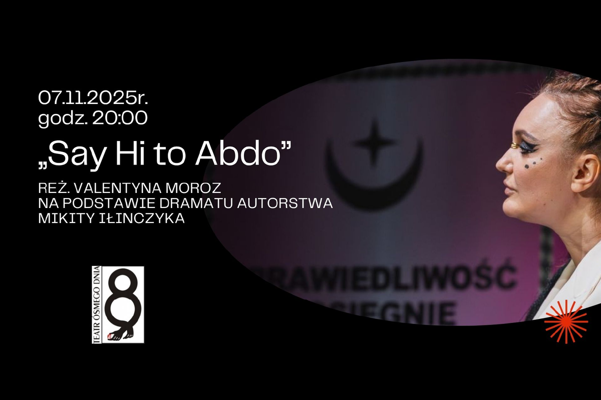 "Say Hi to Abdo” / reż. Valentyna Morozna podstawie dramatu autorstwa Mikity Iłinczyka Scenariusz spektaklu powstał w oparciu o autentyczne dokumenty i relacje migrantów próbujących przekroczyć polsko-białoruską granicę. Materiały stały się impulsem do stworzenia interdyscyplinarnego tekstu o przyszłości Europy. „Say Hi to Abdo” przenosi widzów do 2035 roku, do świata po upadku Unii Europejskiej, zastąpionej przez Euroislamską Unię. Rządy sprawuje partia fem-dżihad, a główną instytucją staje się Państwowy Instytut Ludobójstwa Narodów Arabskich. Właśnie tam toczą się procesy sądowe będące osią dramaturgiczną spektaklu.Przedmiotem osądu są osoby związane z kryzysem migracyjnym na granicy polsko-białoruskiej: właścicielka biura podróży, polski...