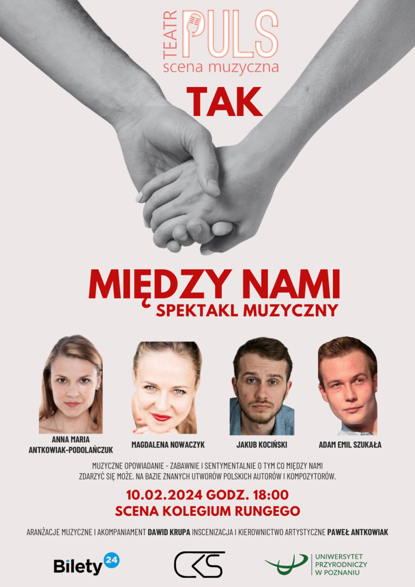 TAK MIĘDZY NAMI Po sukcesach na Sierakowskiej Wiośnie Klasyków i na scenie CKS Mrowisko w Gliwicach, gdzie spektakl wzbudził spory entuzjazm - wśród zgromadzonej publiczności polały się łzy szczęścia i wzruszenia a artyści nagrodzeni zostali owacją na stojąco, pora zaprezentować go na rodzimej Scenie Kolegium Rungego. Muzyczne opowiadanie pt. „Tak między nami” to zabawna i sentymentalna, muzyczna interpretacja relacji damsko – męskich na bazie znanych utworów polskich autorów i kompozytorów. Będzie śmiesznie i wzruszająco. Spektakl pozwala widzowi zanurzyć się w muzykę znaną i teksty dotyczące każdego z nas. Występują: Anna Maria ANTKOWIAK-PODOLAŃCZUK Magdalena NOWACZYK Jakub KOCIŃSKI Adam Emil SZUKAŁA Aranżacja...