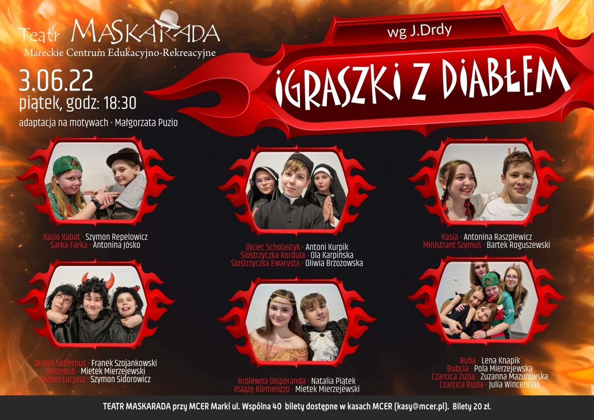 Zapraszamy na spektakl familijny w wykonaniu młodych adeptów sztuki teatralnej z Teatru Maskarada, odpowiedni dla dzieci od 7 roku życia. Baśń sceniczna na motywach czeskiej komedii Jana Drdy "Igraszki z diabłem" w adaptacji Małgorzaty Puzio - to rozśpiewane przedstawienie dla wszystkich. W ludowe postaci z piekła rodem wcielają się młodzi adepci-aktorzy Teatru Maskarada, na co dzień spotykający się w MCER już od 4lat. Zabawny, pełny humoru dla dzieci i dorosłych spektakl, ukazuje odwieczną walkę nieba i piekła. Oczywiście zwycięża dobro, a pokusy naiwnej królewny- Disperandy, czy pyskatej służącej Kasi są potępione. Czarcice, diabełki kontra zakonnice, ministrant i ksiądz to niczym komputerowa gra dla każdego....