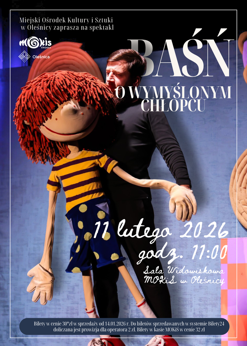 "BAŚŃ O WYMYŚLONYM CHŁOPCU" Spektakl dla dzieci 11 lutego 2026 r., godz. 11:00 Sala widowiskowa MOKiS Sympatyczna i (jak to zwykle w O!Teatrze) komediowa opowieść o poszukiwaniu własnego „ja” w nieco fantastycznym świecie. Opowieść o wyborach i ich konsekwencjach, o sile i wpływie zła, o kształtowaniu własnego charakteru. Tadek, wymyślony bohater nie zamierza brać udziału w wymyślonej dla niego opowieści. W zasadzie to nie zamierza robić nic. Całe szczęście pewien wymyślony leniwiec udowodwodni mu, że nic nie robienie - to nie jest taka prosta sprawa. A co dopiero gdy ktoś woła o pomoc, a w pobliżu czai się prawdziwe zło i to o niejednym obliczu.. Bilety w cenie 30*zł. Do biletów sprzedawanych w systemie Bilety24 doliczana jest...