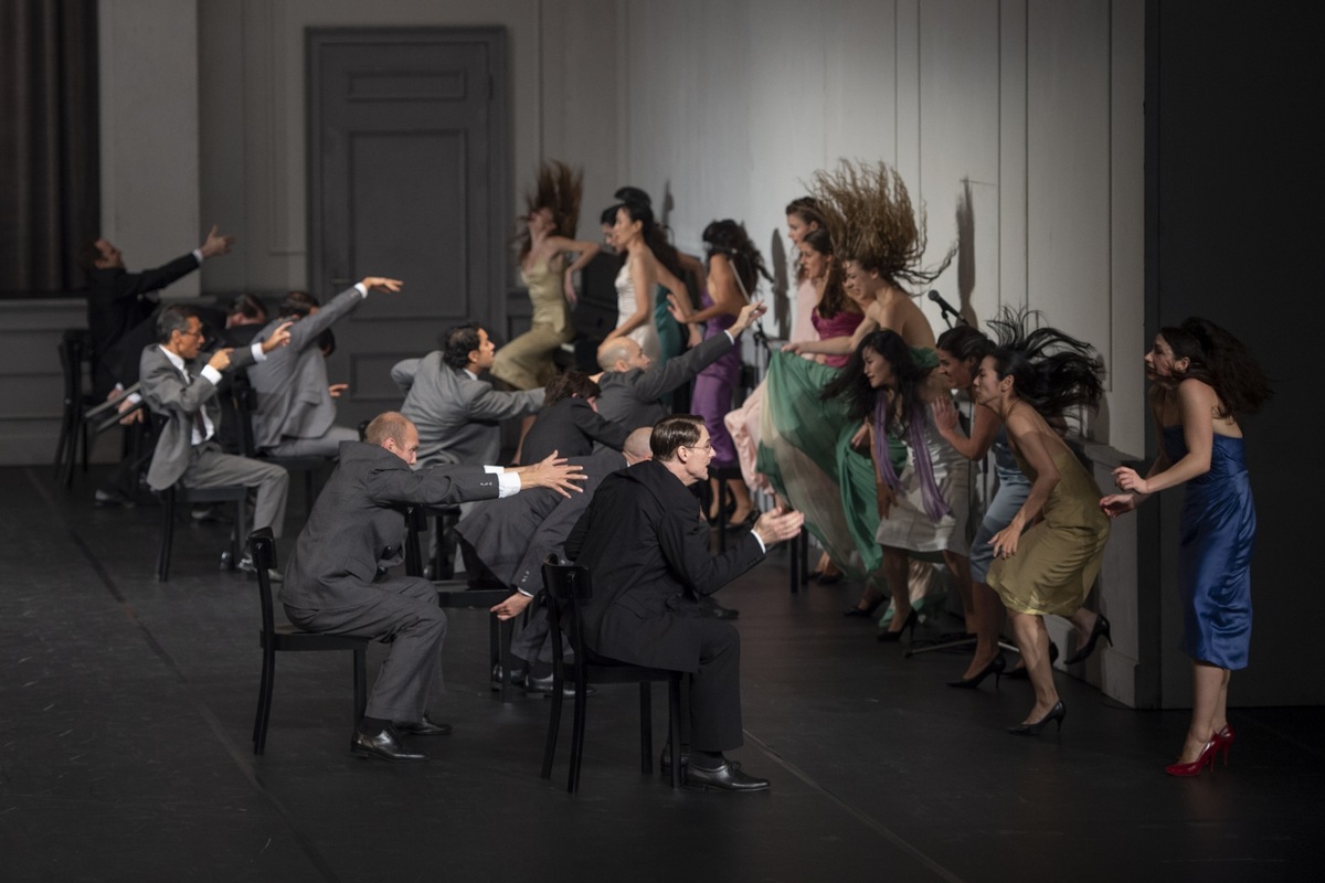 spektaklu jest sala taneczna, na której grupa mężczyzn ubranych w luźne garnitury oraz kobiet w