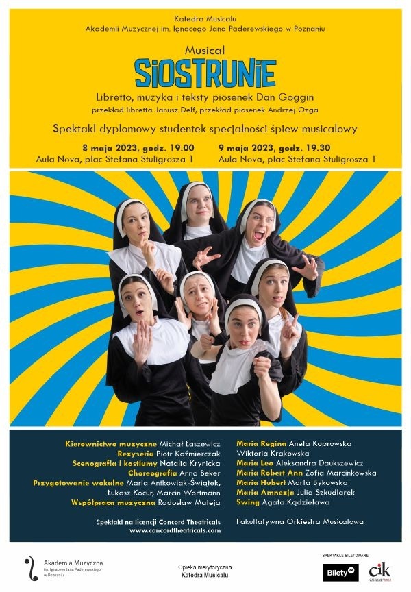 We wtorek 9 maja 2023 r. o godz. 19.30 zapraszamy do Auli Nova na musical Siostrunie. Libretto, muzyka i teksty piosenek: Dan Goggin Kierownictwo muzyczne: Michał Łaszewicz Reżyseria: Piotr Kaźmierczak Scenografia i kostiumy: Natalia Krynicka Choreografia: Anna Beker Przygotowanie wokalne: Maria Antkowiak, Łukasz Kocur, Marcin Wortmann Występują: Maria Regina — Aneta Koprowska / Wiktoria Krakowska, Maria Leo — Aleksandra Daukszewicz, Maria Robert Ann — Zofia Marcinkowska, Maria Hubert — Marta Bykowska, Maria Amnezja — Julia Szkudlarek, Swing — Agata Kądzielawa Fakultatywna Orkiestra Musicalowa Spektakl na licencji Concord Theatricals: www.concordtheatricals.com*******