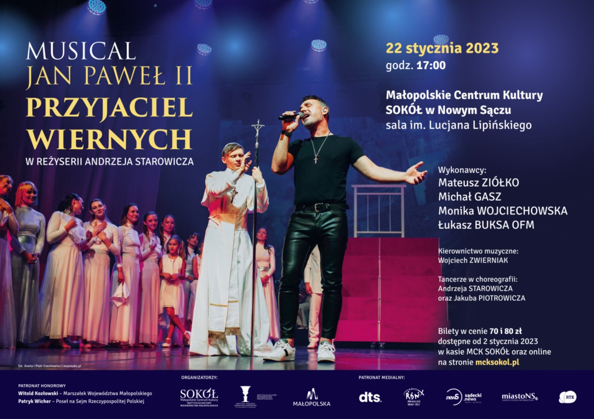 W niedzielę 22 stycznia o godzinie 17:00 zapraszamy na musical poświęcony Janowi Pawłowi II. Widowisko zostało przygotowane na zlecenie Instytutu Dialogu Międzykulturowego im. Jana Pawła II w Krakowie.