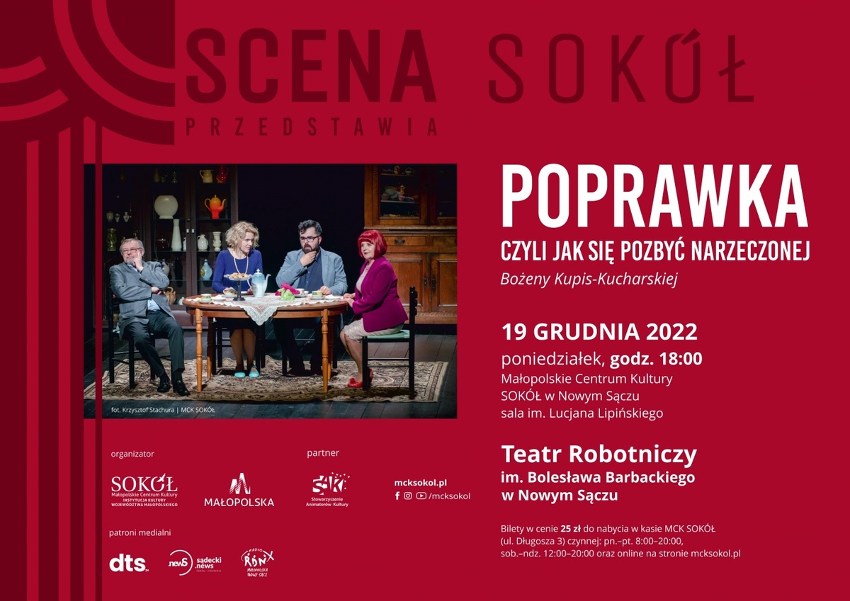 19 grudnia br. (poniedziałek) o godz. 18.00 w sali im. L. Lipińskiego Małopolskiego Centrum Kultury SOKÓŁ w Nowym Sączu Teatr Robotniczy im. Bolesława Barbackiego po raz kolejny zagra komedię autorstwa Bożeny Kupis-Kucharskiej pt. „POPRAWKA, czyli JAK SIĘ POZBYĆ NARZECZONEJ”. Wydarzenie odbędzie się w ramach Sceny SOKÓŁ.