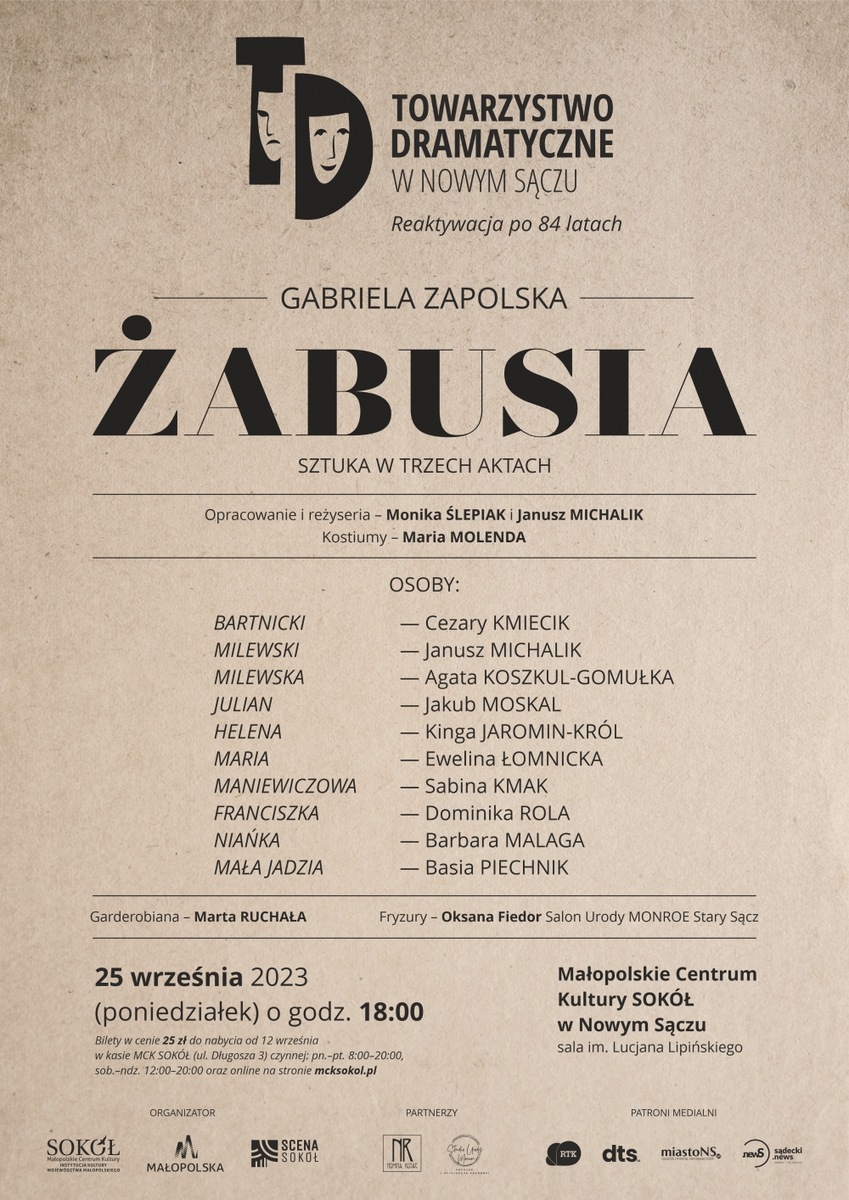 „ŻABUSIA” na Scenie SOKÓŁ Po wakacyjnej przerwie na scenę Małopolskiego Centrum Kultury SOKÓŁ w Nowym Sączu wraca sztuka Gabrieli Zapolskiej pt. „Żabusia” w wykonaniu Teatru Towarzystwa Dramatycznego, które w kwietniu br. wznowiło – po 83 latach przerwy – swoją działalność premierą tego właśnie dramatu. Przedstawienie będzie miało miejsce w sali im. L. Lipińskiego MCK SOKÓŁ, w dniu 25 września br. (poniedziałek) o godz. 18.00. W spektaklu, wyreżyserowanym przez Monikę Ślepiak i Janusza Michalika, zobaczymy: Cezarego Kmiecika (Bartnicki), Janusza Michalika (Milewski), Agatę Koszkul-Gomułkę (Milewska), Jakuba Moskala (Julian), Kingę Jaromin -Król (Helena), Ewelinę...