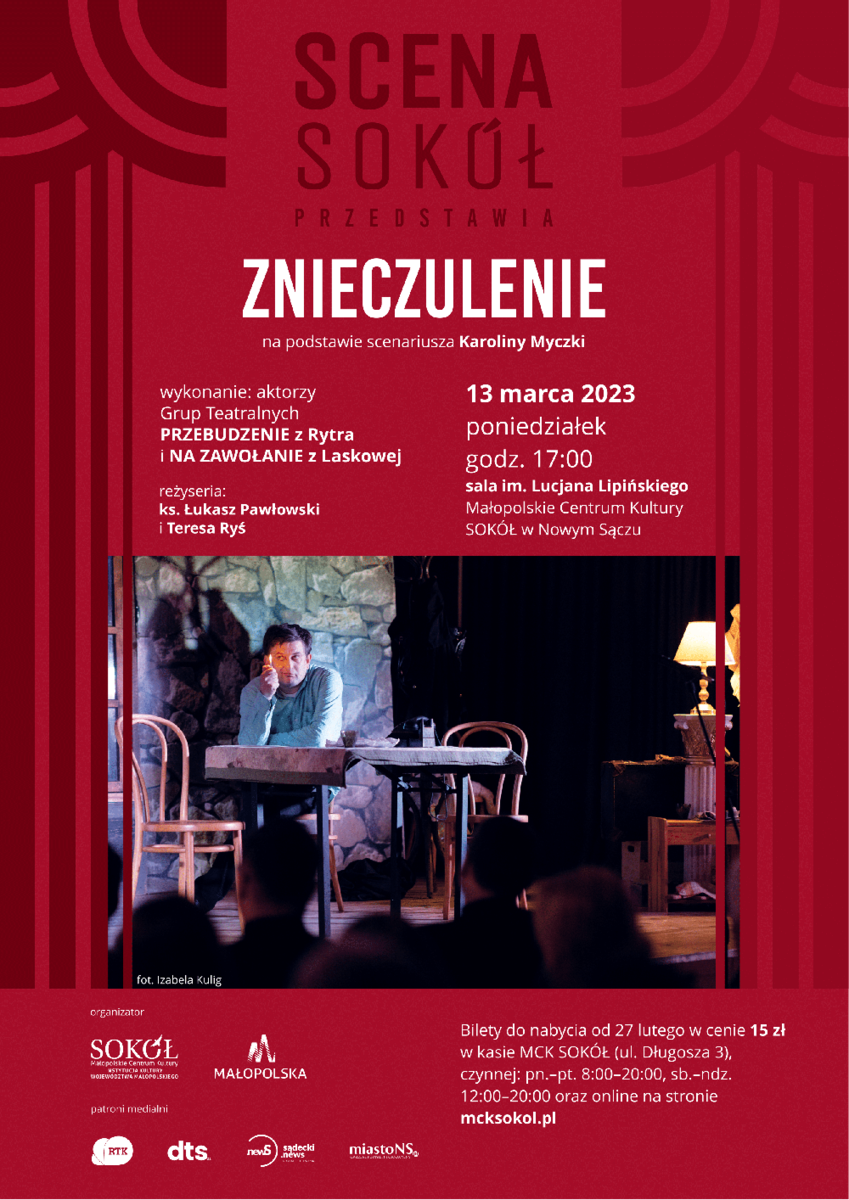 Małopolskie Centrum Kultury SOKÓŁ w Nowym Sączu zaprasza na kolejne teatralne spotkanie w ramach Sceny SOKÓŁ, które odbędzie się 13 marca 2023 r. (poniedziałek) o godz. 17.00 w sali im. L. Lipińskiego. Spektakl pt. „ZNIECZULENIE”, powstał na podstawie scenariusza Karoliny Myczki, dzięki wspólnej pracy aktorów Grup Teatralnych - PRZEBUDZENIE z Rytra i NA ZAWOŁANIE z Laskowej pod artystycznym kierownictwem ks. Łukasza Pawłowskiego i Teresy Ryś. Sztuka opowiada o rodzinie, w której kobieta nie ma męża a jej syn ojca, co ma ogromny wpływ na duchowy rozwój obojga. Matka nie może nawiązać właściwych relacji z synem, syn z matką, przez co obojgu trudno uwolnić się od patologicznego układu. Aby wytrzymać w takim zniewoleniu, syn decyduje się na...