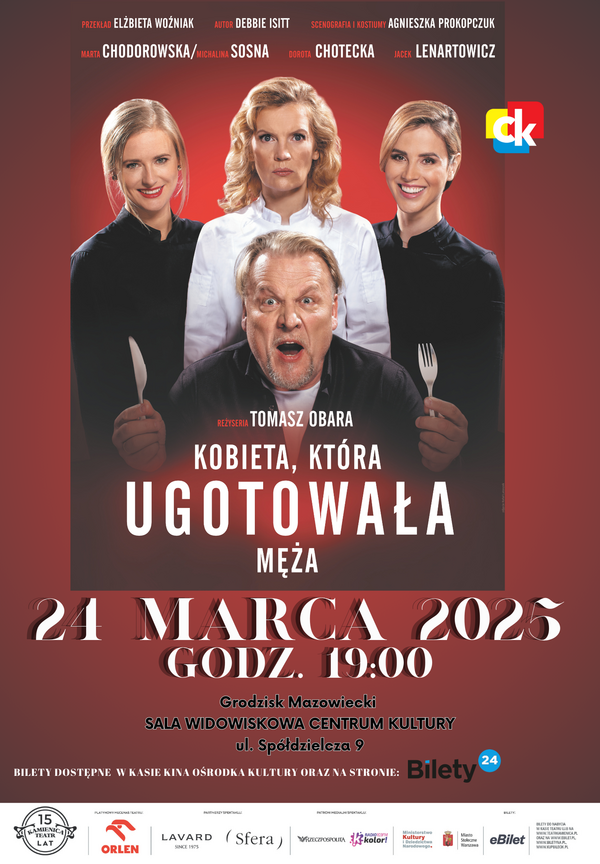 Pikantny tekst, apetyczna obsada i wyśmienita reżyseria – to składniki wybornego przedstawienia. Jak smakuje przygotowane z artystyczną starannością, najnowsze w karcie, danie główne serwowane przez Teatr Kamienica? Opinie prawdziwych smakoszy teatru są celujące, więc zapraszamy do stołu. To znaczy na widownię! OPIS SPEKTAKLU Hilary (Dorota Chotecka) to świetna gospodyni, która bardzo dba o podniebienie męża. Kenneth (Jacek Lenartowicz) uwielbia dobrze zjeść i jest przyzwyczajony do tego, by mu usługiwano. Pragnąc jednak uczuciowej odmiany, zamienia Hilary na nowszy model, Laurę (Marta Chodorowska/Michalina Sosna). „Kobieta, która ugotowała męża” to nowoczesna forma tragikomedii. W sztuce tej, jak w życiu, lawiny śmiechu, a czasem łzy, występują...