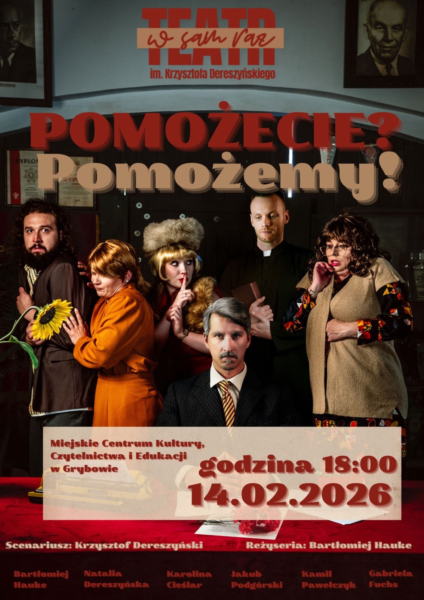„Pomożecie? Pomożemy! ” – to satyryczna refleksja nad mechanizmem władzy gdzie absurd, groteska i humor miesza się z goryczą szarej codziennej rzeczywistości mieszkańców wsi.