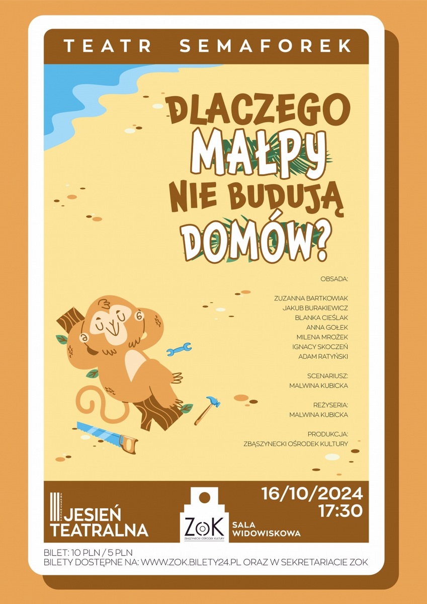 Małpkom kibicuje wiekowy żółw i dwie egzotyczne papużki, które wierzą w sukces budowlany niesfornych zwierzaków. Każdy kolejny dzień, przynosi małpkom nowe pomysły, ale też ciągłe zmiany w podejmowanych decyzjach. Czy małpką uda się wybudować wymarzone domy? Przekonacie się przychodząc na najnowszy spektakl Teatru Dziecięcego Semaforek.