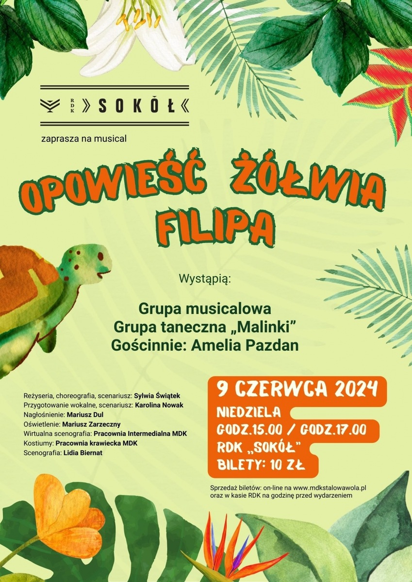 Zapraszamy na musical pt. "Opowieść żółwia Filipa", który przeniesie nas w hawajskie, pełne koloru klimaty. Żółw Filip w towarzystwie zabawnych fok, które nie pozwolą nam się nudzić przedstawi szalenie ciekawą historię. W tle opowieści pojawią się zabawne zwierzątka, dzikie plemiona, a także nierozwiązana tajemnica. Czy dowiemy się jak potoczyły się losy zaginionej księżniczki? Czy władca wyspy odnajdzie swoją córkę? A może chytra wiedźma przeszkodzi w szczęśliwym zakończeniu historii?