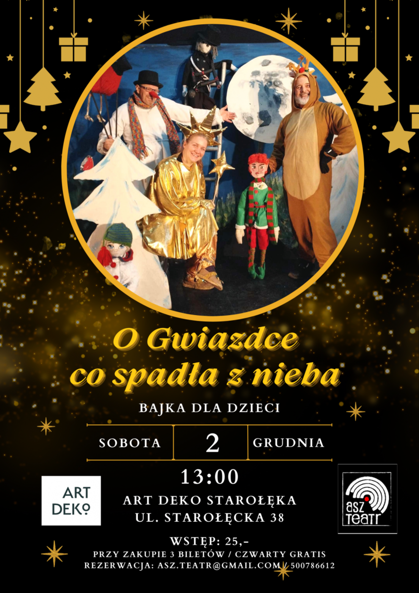 Teatr asz.teatr zaprasza na specjalną mikołajkową sobotę w ART DEKO STAROŁĘKA. O GWIAZDCE CO SPADŁA Z NIEBA scenariusz: Anna Szymczak scenografia: Barbara Gazdecka Co się stanie, gdy najważniejsza z Gwiazdek, tuż przez Wigilią spadnie z Nieba? Na pewno zrobi się wielkie zamieszanie zarówno na Niebie jak i na Ziemi. Do tego nasz Gwiazdka zupełnie zapomniała kim jest i co się stało. Na szczęście na jej drodze pojawi się Bałwanek Zdzisio i Reniferek Henio. Ta dwójka zrobi wszystko, by Gwiazdka trafiła na Niebo. Czy im się uda? Sami się przekonacie. Dobrze, że mają takiego przyjaciela jak Święty Mikołaj, ponieważ ten znajdzie rozwiązanie każdego problemu. Zapraszamy na kolorową, wesołą i bardzo mikołajkową bajkę. występują: Dagmara Tyrcha Roman...