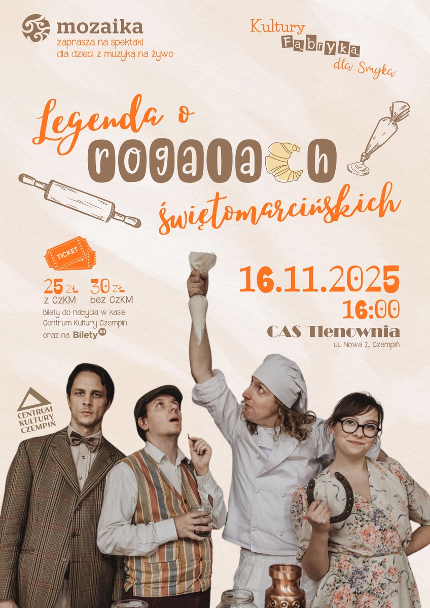 Kto z Was lubi słodkie rogale i muzykę? Wierzymy, że wszyscy! Podczas spektaklu przeniesiemy się w odległe czasy na nie tak odległą ulicę Święty Marcin. Poznamy historię, dzięki której co roku w Poznaniu objadamy się rogalami świętomarcińskimi i razem je zrobimy. Dowiemy się też, kim był Marcin i co miał wspólnego z pewnym wyjątkowym piekarzem, który postanowił zrobić coś bardzo dobrego dla innych ludzi… Do zabawy porwie wszystkich muzyka, taniec i piosenki przygotowane specjalnie na tę okazję przez Przemka Mazurka.