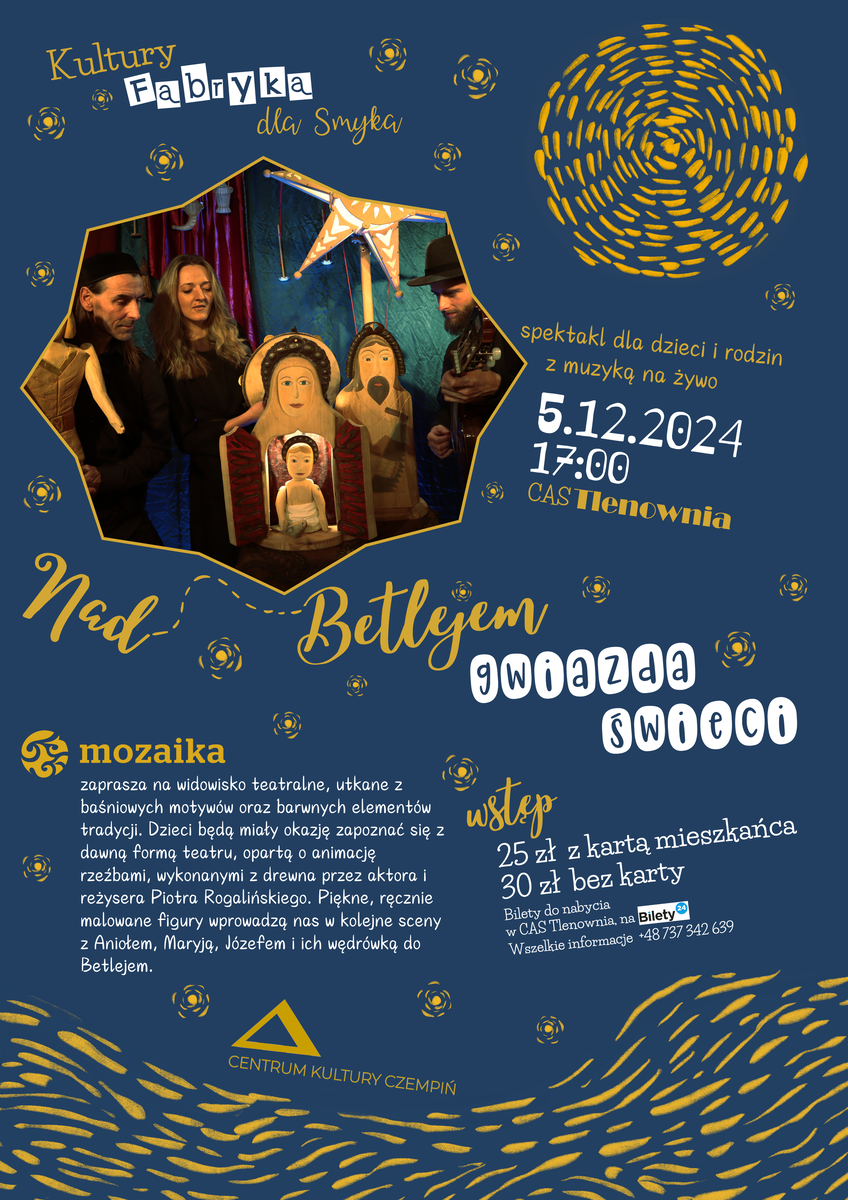 5 grudnia zapraszamy na kolejny z cyklu "Kultury Fabryka dla Smyka" spektakl dla dzieci i rodzin z muzyką na żywo pt. "Nad Betlejem gwiazda świeci". Teatr Mozaika zaprasza na widowisko teatralne, utkane z baśniowych motywów oraz barwnych elementów tradycji. Dzieci będą miały okazję zapoznać się z dawną formą teatru, opartą o animację rzeźbami, wykonanymi z drewna przez aktora i reżysera Piotra Rogalińśkiego. Piękne, ręcznie malowane figury wprowadzą nas w kolejne sceny z Aniołem, Maryją, Józefem i ich wędrówką do Betlejem.*******