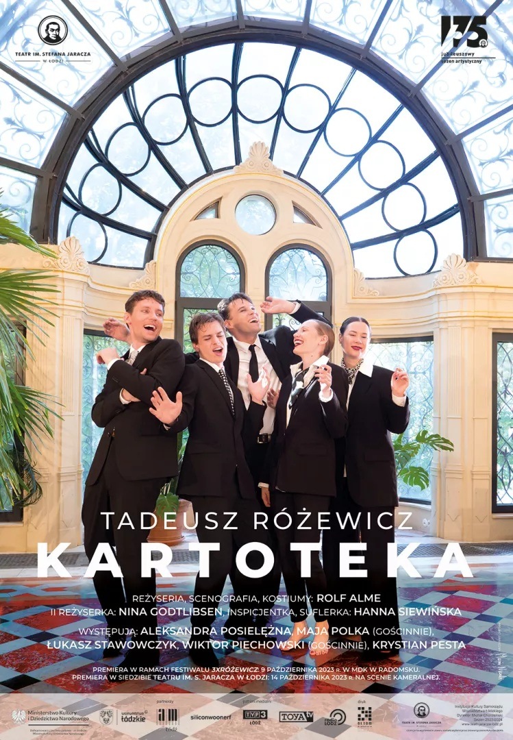 Opublikowana i po raz pierwszy wystawiona w roku 1960, Kartoteka Tadeusza Różewicza zaliczana bywa do dramatów z nurtu Teatru Absurdu. Tak jak sztuki Samuela Becketta, Eugene'a Ionesco i innych przedstawicieli tego gatunku, pokazuje sytuację egzystencjalną człowieka w dwudziestym wieku. Rolf Alme, reżyser spektaklu w naszym teatrze, wprowadzając nas w świat snu Bohatera, eksploruje absurd zawarty w tekście Różewicza. Tworzy surrealistyczne uniwersum. Wybrzmiewają w nim echa drugiej wojny światowej. Zagłusza je jednak momentami radość młodego człowieka, który po prostu chce żyć i żyć może, bo nie spadają mu na głowę bomby, żaden żołnierz nie mierzy do niego z broni, nikt nie chce go zabić. Do starcia tych dwóch rzeczywistości dochodzi w głowie Bohatera, tworząc na scenie wizję niepokojącą i wzruszającą. Jest w niej miejsce na chwile powagi, ale też beztroski, zadumy i euforii.