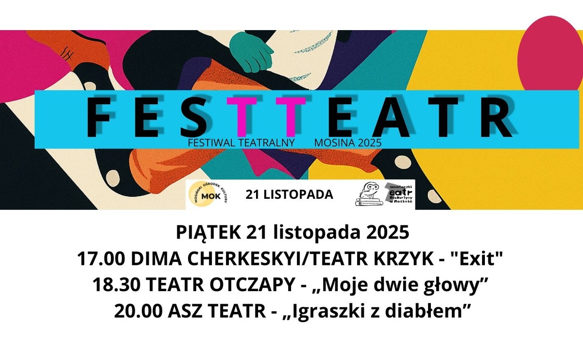 Zapraszamy na FesTTeatr - Festiwal teatralny Mosina 2025! To już trzecia edycja naszego święta teatru. W dniach 21-22 listopada na deskach Mosińskiego Ośrodka Kultury zobaczymy 6 spektakli. Będzie i śmiesznie, i strasznie, i niespodziewanie. Dotkniemy natury człowieka na wiele sposobów i gwarantujemy, że nie wyjdziecie z FesTTeatru obojętni. Tu trzeba być! FesTTeatr to spektakle, spotkania z twórcami, warsztaty dla aktorów, wystawa kostiumów filmowych i teatralnych oraz dobra kawa z ciachem między spektaklami. Festiwal to też aż dwie PREMIERY - tego nie można przegapić!*******