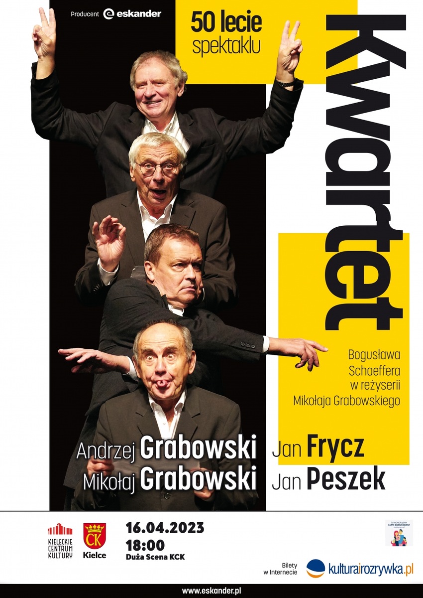 „Kwartet” Bogusława Schaeffera to inteligentny i dowcipny teatr w wyśmienitej obsadzie, gdzie bohaterowie usiłują odpowiedzieć na pytania fundamentalne. Ambitna próba znalezienia uniwersalnego i niepodważalnego ideału sztuki w miarę rozwoju spektaklu przemienia się w nieprzewidywalną grę z widzem, pełną żartów, przekomarzania i prowokacji, w trakcie której nikt nie może się czuć bezpieczny – ani aktorzy, ani publiczność odważnie włączana do występu. Na oczach widzów tekst wybitnego polskiego kompozytora i ledwie zarysowana sytuacja dramatyczna stają się pretekstem dla fascynujących improwizacji znakomitych aktorów, którzy zostawiają sobie duży margines na zabawę z publicznością, dzięki czemu każdy spektakl jest zupełnie inny od pozostałych!...