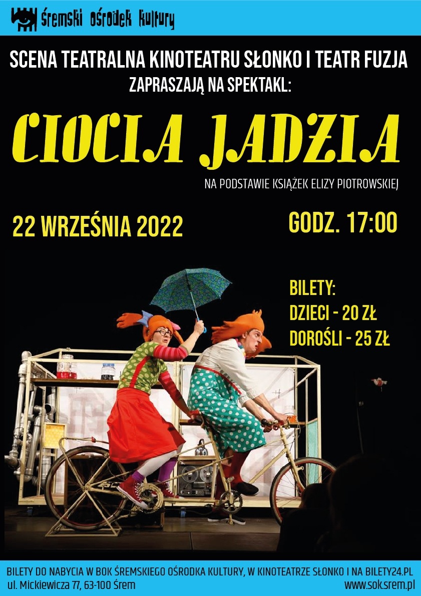 Już w czwartek 22 września o godz. 17:00 zapraszamy serdecznie do Kinoteatru Słonko na spektakl w wykonaniu Teatru Fruzja pt. „Ciocia Jadzia” na podstawie książek Elizy Piotrowskiej. Ciocia Jadzia to ciocia, o jakiej marzy każde dziecko, a przynajmniej niezależne i zadziorne dziewczynki, którym ciągle ktoś dorosły mówi, co mają robić. Ciocia Jadzia to ciepły, zaskakujący ipełny humoru spektakl, w którym oprócz tytułowej bohaterki zobaczymy inne barwne postacie takie, jak: Pelagia Rzepa, Stefan Salceson, czy Genek Powsinoga. Ciocia Jadzia jest siostrą mojego tatusia. Nie wiem, jak jednocześnie można być siostrą i ciocią, ale chyba można. W każdym razie cioci Jadzi się udaje. Ciocia Jadzia jest taka duża, że nie wiadomo gdzie się zaczyna, a gdzie...
