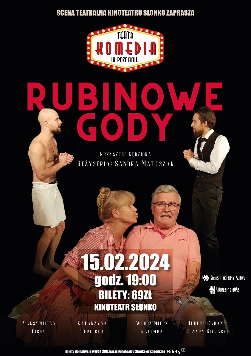 Czterdziesta, czy czterdziesta pierwsza rocznica ślubu… Kto to liczy? Rocznica stanie się niezapomnianą i to wcale nie z powodu wyjazdu do luksusowego hotelu! Choć dla małżeństwa to duża nowość, w której nie do końca potrafią się odnaleźć. Problem ten szybko schodzi jednak na plan dalszy, za sprawą tajemniczego gościa… będącego w ich pokoju. Zdrady, intrygi, trójkąt, wścibski boy hotelowy, zabawki erotyczne, skandal polityczny na szczytach władzy – to wszystko w naszej najnowszej nietuzinkowej komedii „Rubinowe Gody”. reżyseria: Sandra Matuszak czas trwania: 120 min. Bilety w cenie 69 zł do nabycia: - w BOK ŚOK - w kasie Kinoteatru Słonko - poprzez serwis Bilety24.pl Do zobaczenia.*******