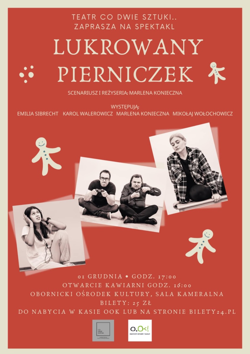 "Lukrowany pierniczek" to odprężające połączenie spektaklu obyczajowego z elementami komedii.W starym domu w środku lasu, wraz z nastoletnią córką, mieszka Janek - owdowiały pisarz, którego życie, zdawać by się mogło, z dnia na dzień straciło sens. Tęskniąca za miastem pełnym rozrywek oraz rówieśnikami Dobrochna, za wszelką cenę próbuje ratować ojca pogrążającego się w coraz większym marazmie. Gdy jej starania spełzają na niczym, wzywa na pomoc wuja, który stanowi jej ostatnią deskę ratunku. Czy pewny siebie, kochający życie Michał, będzie potrafił na nowo wskrzesić w Janku nadzieję? Tak mu się wydaje, dopóki na jego drodze nie stanie pełna żalu Zosia, gospodyni Janka, której język jest nie mniej ostry, niż noże używane przez nią w kuchni.Jeden...