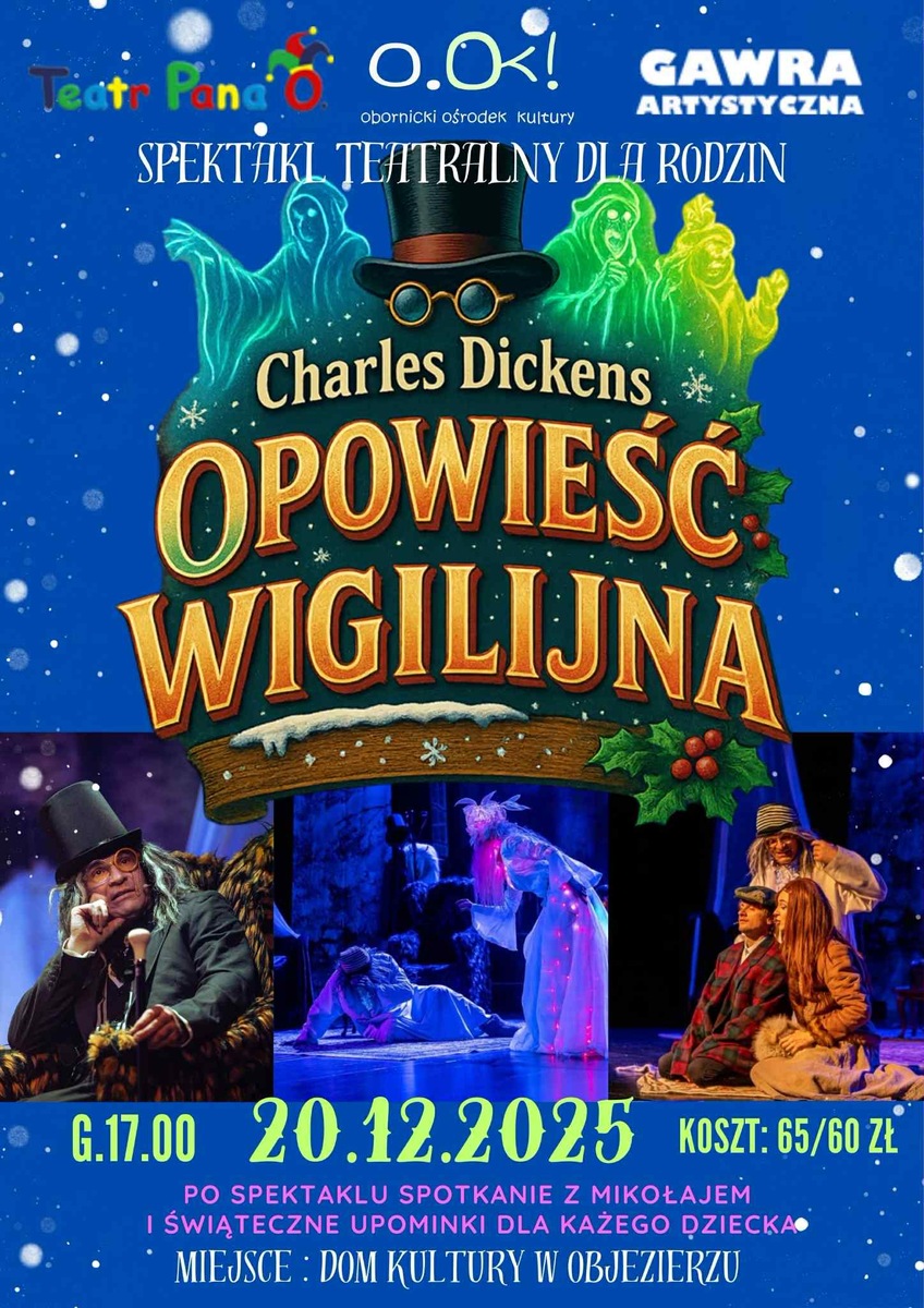 „Opowieść wigilijna” – rodzinny spektakl teatralny na podstawie klasycznej powieści Charlesa Dickensa Zapraszamy na wyjątkowe, pełne magii przedstawienie świąteczne, które przeniesie widzów w niezwykły świat „Opowieści wigilijnej”. To ponadczasowa historia o przemianie, dobroci i sile świątecznego ducha, zaprezentowana w barwnej, widowiskowej formie przez Teatr Pana O. oraz Gawrę Artystyczną. Po spektaklu na najmłodszych czeka wyjątkowa niespodzianka: *******