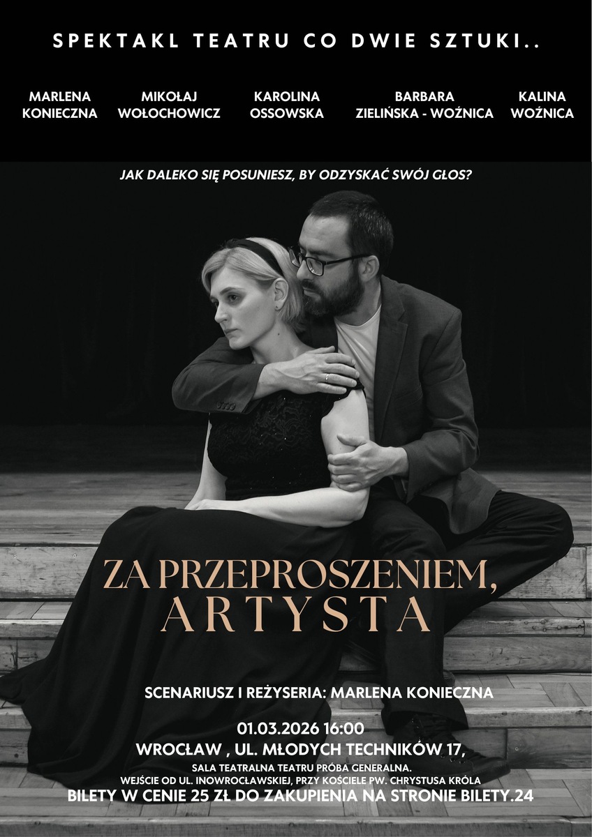 GDY MIŁOŚC POTKNIE SIĘ O ZAZDROŚĆ...Jak wiele może zepsuć niedopowiedzenie? Co potrafią zniszczyć nierozwiane domysły? I czy szczerość bywa rzeczywiście najlepsza? Przed tymi pytaniami stają Lena i Aleksander, bohaterowie spektaklu "Za przeproszeniem, Artysta", a znalezienie odpowiedzi wydaje się konieczne do tego, by przetrwać we dwoje.Spektakl we Wrocławiu: "Za przeproszeniem, Artysta" Czas: 1 marca 2026 godz. 16:00.Scena mieści się przy Kościele pw. Chrystusa Króla Młodych Techników 17, 53-647 Wrocław,wejście do sali od ul. Inowrocławskiej*******