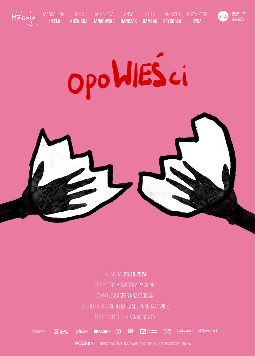 "OpoWIEŚci" to kompilacja fragmentów z Konopielki, monologu ze sztuki Wyrypajewa, sceny z serialu Ranczo i sond ulicznych znalezionych w Internecie. OPOWIEŚCI mówią o zmianach, czy są dobre czy złe, czy potrafimy obchodzić się ze zmianami, czy potrafimy się zmieniać... reżyserka: Agnieszka Pawlak Światło: Kacper Krzyżosiak Choreografia: Scheherezade Kondratowicz Fotografie i film: Hanna Bauta Obsada: Magdalena Smela, Daria Kuźnicka, Agnieszka Jankowska, Anna Hanczak, Piotr Ramlau, Krzysztof Cyga, Andrzej Spychała*******