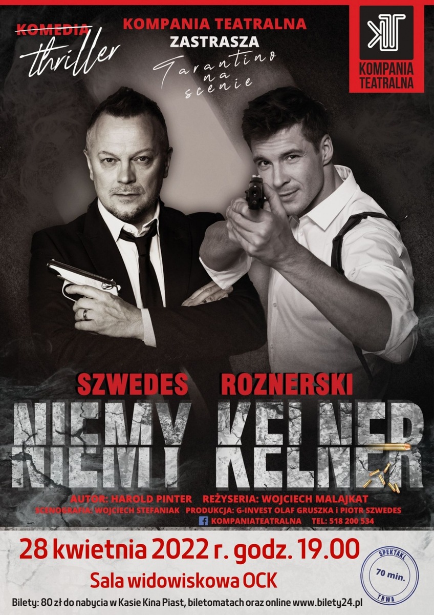NIEMY KELNER Ostrzeszowskie Centrum Kultury oraz Kompania Teatralna zaprasza Państwa do pokoju w dziwnym hotelu z dwoma co najmniej dziwnymi gangsterami, gdy na zewnątrz zaczai się świat w postaci tajemniczego "dyspozytora". Jakże eksploatowany obecnie, zapowiadany już dawno przez Orwella, wszechobecny Wielki Brat. Para typów podejrzanego autoramentu to intrygujący motyw zarówno filmowy jak i literacki. U Becketta: Vladimir i Estragon, u Quentina Tarantino? A proszę, chociażby w Pulp Fiction: pamiętacie taniec Travolty, psalmy głoszone przez Samuela L. Jacksona, czy też zegarek skrzętnie przechowany w-i po- ojcu Bruce'a Willisa..? Tarantino odrobił lekcje... my je sprawdzamy... wy ocenicie... dzięki bohaterom Niemego Kelnera, Benowi i Gusowi,...