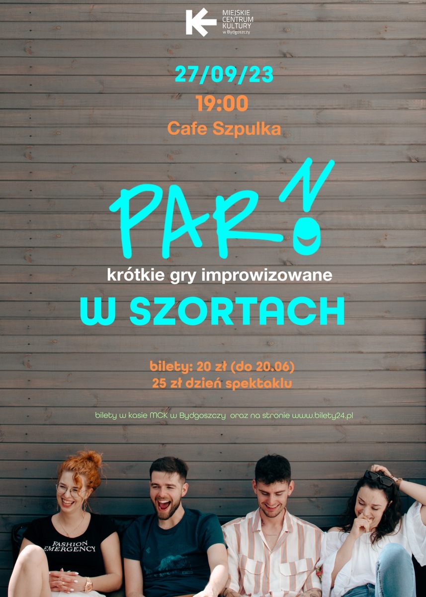 PARNO w szortach – krótkie gry improwizowane 27.09.2023 r. 19.00 Music Cafe Szpulka w Miejskim Centrum Kultury w Bydgoszczy Tęskniliście? Bo my bardzo! Po wakacyjnej przerwie wracamy do Was zaopatrzeni w mnóstwo pozytywnej energii, w wiedzę, w jeszcze więcej kreatywności i szaleństwa, którymi chcemy się z Wami podzielić w kolejnej części PARNO w szortach! PARNO w szortach to cykl występów, podczas których gramy krótkie, lekkie i śmieszne gry improwizowane! Do pełnego sukcesu, są nam jeszcze potrzebne inspiracje publiczności – i tutaj Wasza ważna rola! To WY decydować będziecie o naszych losach na scenie, rzucając sugestie, którymi będziemy się inspirować. To, co tam zobaczycie, będzie powstawać na Waszych oczach, nigdy wcześniej tego nie graliśmy...