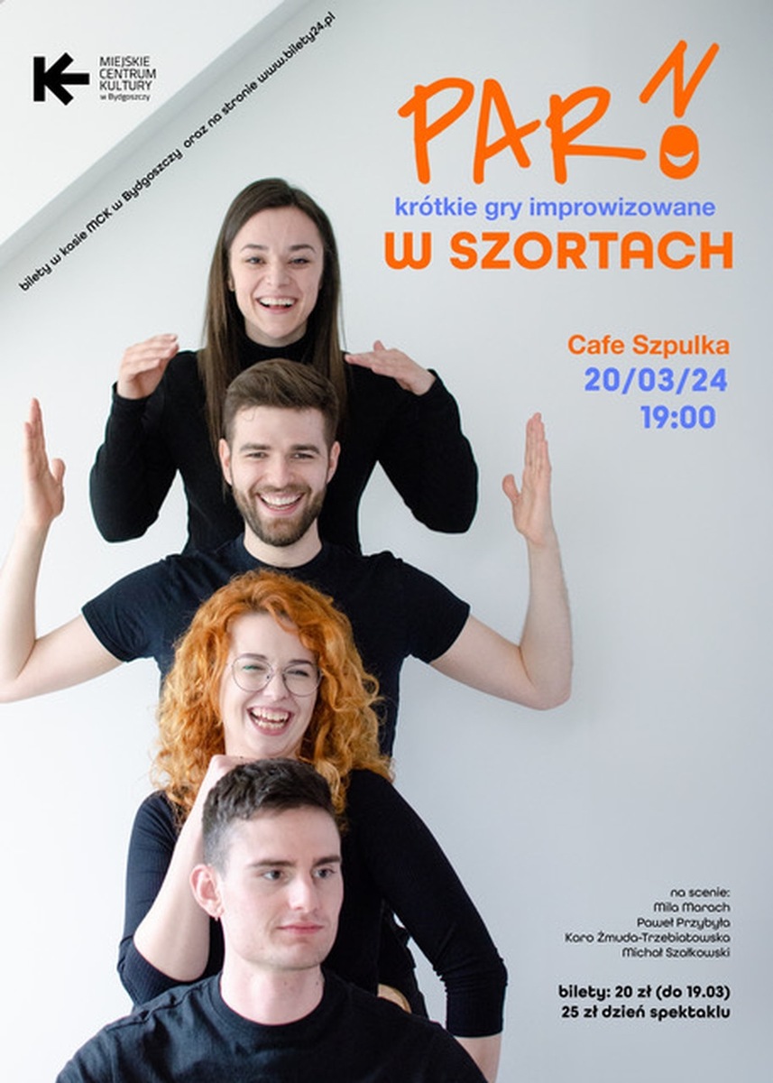 Spektakl improwizowany: PARNO W SZORTACH Czy kiedykolwiek marzyliście o spektaklu, gdzie aktorzy mają mniej pojęcia o tym, co się wydarzy, niż publiczność? Gdzie scenariusz zmienia się szybciej niż moda na TikToku? Tak, dokładnie! Przedstawiamy Wam PARNO – jedyny w swoim rodzaju teatr improwizowany, który przekształci Wasz wieczór w kalejdoskop brawurowego humoru. Dołącz do nas, jeśli: Szukasz wieczoru pełnego śmiechu i niespodzianek. Chcesz zobaczyć, jak z pozornie zwyczajnych propozycji rodzą się najdziksze historie. Masz ochotę na interaktywne doświadczenie, gdzie Ty decydujesz, co stanie się na scenie. Nie przegap okazji, by być częścią czegoś wyjątkowego. Przyjdź i zobacz, jak z improwizacji rodzi się magia. Widzimy się 20 marca o godz.19.00...