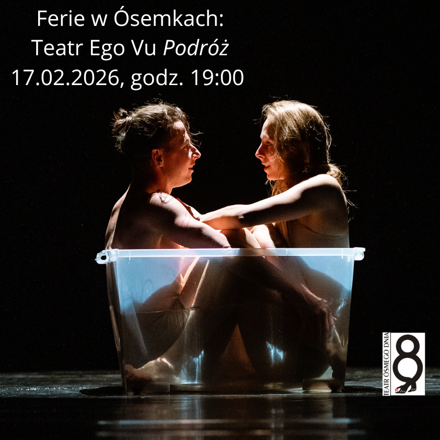 Ferie w Ósemkach: Teatr Tańca EGO VU "Podróż" „Wsparcie drugiego człowieka to jak towarzyszenie mu w wyczerpującej podróży, która jest pełna niewygodnych uczuć, chwil zwątpienia, niechcianych myśli oraz szukanie wspólnego celu i sensu życia. Bycie tuż obok pozwala stworzyć więź, która jest silna aż do śmierci, a między dwojgiem bliskich sobie ludzi rodzi się wsparcie. Chcemy by odbiorca spektaklu mógł znaleźć w „naszej podróży” być może swoje przeżycia, tęsknoty, myśli i cele. Wszystkie ścieżki, które zostaną przebyte w trakcie spektaklu, mimo zawiłości zbudują szeroką dobrze ubitą drogę, może pozwoli to wejść w nowy etap wspólnego bycia i życia- działania według idei związku „nigdy nie będziesz szedł/szła sam/a!” Teatr Tańca EGO VU Choreografia,...