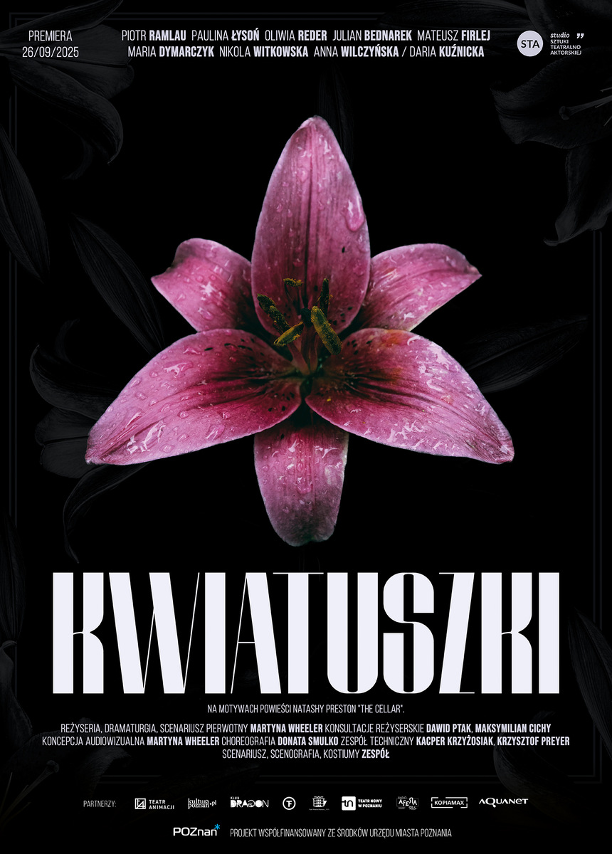 „Ludzka psychika chyba nigdy nie przestanie mnie zadziwiać. Szczególnie ta cienka jak liść granica między jej niebywałą zdolnością do adaptacji…a delikatną kruchością. Tak delikatną jak płatki kwiatów.” Czy zło czynione z czystych intencji można próbować usprawiedliwić? Historia Kwiatuszków to czuły horror, opowieść o cierpiącej nadziei, tragedii przetrwania, ale i odwadze w bezsilności. To historia zbrodni, bezczelnie stawiająca widza przed obrazem rzeczywistości, w której strach jest codziennością a krzyki odbijają się od ścian, nigdy nie docierając na zewnątrz. Reżyseria, dramaturgia, scenariusz pierwotny: Martyna Wheeler Konsultacje reżyserskie: Dawid Ptak | Maksymilian Cichy Koncepcja audiowizualna: Martyna Wheeler Choreografia: Donata...