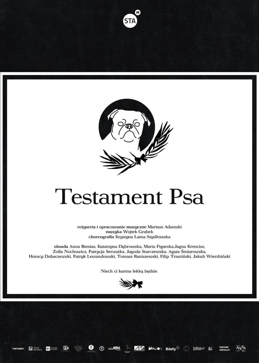 „Testament psa, czyli historia o miłosiernej”. Uwaga! Wszystkich parafian zapraszamy na pogrzeb psa Szarika. Zasłużony dla naszej parafii osobnik ostanie pochowany w najbliższych dniach na cmentarzu przy naszym kościele na Ratajczaka 18. Przed ceremonią zostanie odczytany testament. Prosimy o stosowny ubiór i stosowną ofiarę. No właśnie. Przypominamy - zawsze muszą być jakieś ofiary…. Reżyseria i opracowanie muzyczne: Mariusz Adamski Muzyka: Wojtek Grabek Choreografia: Krystyna Lama Szydłowska Obsada: Anna Bienias, Katarzyna Dąbrowska, Marta Figurska, Jagna Krencisz, Zofia Nochowicz, Patrycja Serwatka, Jagoda Starczewska, Agata Śmiarowska, Horacy Dobaczewski, Patryk Lewandowski, Tomasz Raniszewski, Filip Trawiński, Jakub Wierzbiński*******