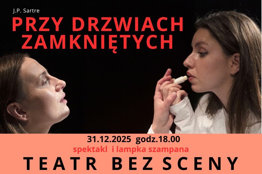 Spektakl w Sylwestra o godz. 18.00 program: spektakl i lampka szampana z tradycyjnymi zimnymi ogniami pod muralem Mony Tusz, zakończenie ok. godz. 20.00 spektakl J.P. Sartre PRZY DRZWIACH ZAMKNIĘTYCH scenografia i reżyseria Andrzej Dopierała występują: Katarzyna Gołąb, Aleksandra Szokiel - Zaufal, Maciej Siwy*******