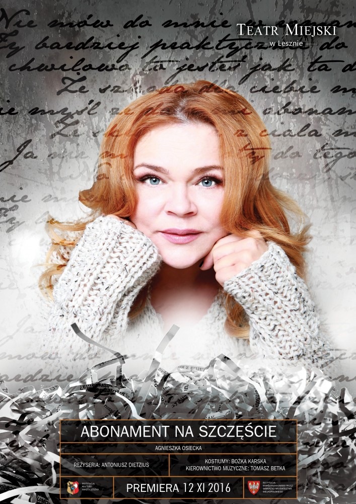Abonament na szczęście" to lekki, pełen humoru, nostalgii i wzruszeń jednoaktowy spektakl oparty na szerokiej twórczości Agnieszki Osieckiej. Jej wypowiedzi, listy, wiersze oraz teksty piosenek splatać się będą w autorskim projekcie muzycznym Antoniusza Dietziusa.