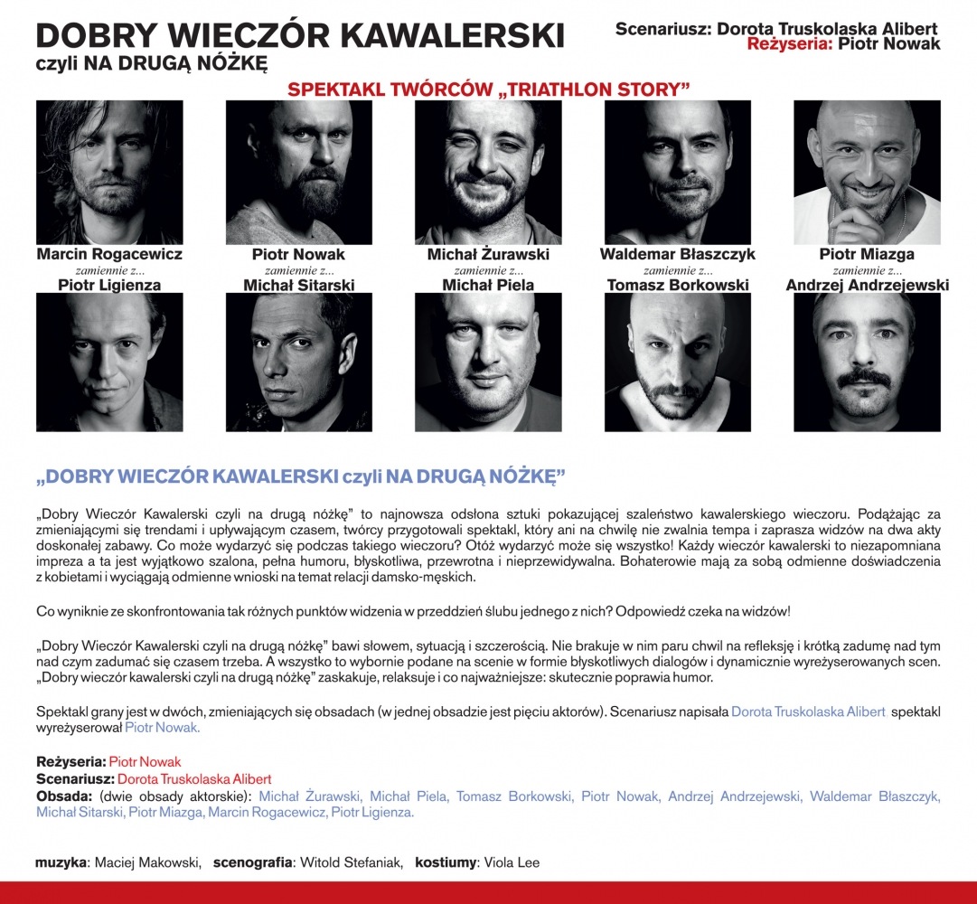 DOBRY WIECZÓR KAWALERSKI czyli NA DRUGĄ NÓŻKĘ" "Dobry Wieczór Kawalerski czyli na drugą nóżkę" to najnowsza odsłona sztuki pokazującej szaleństwo kawalerskiego wieczoru. Co może się wydarzyć podczas takiego wieczoru? Otóż wydarzyć może się wszystko! Każdy wieczór kawalerski to niezapomniana impreza! A ta jest wyjątkowa, pełna humoru, przewrotna i nieprzewidywalna. Nasi bohaterowie mają za sobą zaskakujące życiowe doświadczenia z kobietami i wyciągają z nich odmienne wnioski na temat relacji damsko-męskich. Co wyniknie ze skonfrontowania tak różnych punktów widzenia w przeddzień ślubu jednego z nich? Odpowiedź czeka na widzów!*******