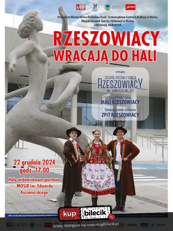 Zespół Pieśni i Tańca "Rzeszowiacy" nie schodzi z wielkiej sceny. W zeszłym roku "Rzeszowiacy" po raz pierwszy zatańczyli w nowej hali MOSiR przy ponad 2-tysięcznej publiczności, a 16 listopada b.r., przy podobnej widowni, wystąpili jako zespół poprzedzający występ Państwowego Zespołu Ludowego Pieśni i Tańca "Mazowsze" podczas wielkiego koncertu na hali MOSiR. Teraz znów zaprezentują się przed mielecką publicznością w Hali Widowiskowo-Sportowej MOSiR, tym razem wraz z całą familią. Wystąpi więc skład reprezentacyjny ZPiT "Rzeszowiacy", Chór absolwentów ZPiT "Rzeszowiacy", "Mali Rzeszowiacy" i Stowarzyszenie Seniorów ZPiT "Rzeszowiacy".