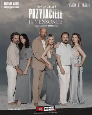 PRZYJACIELE / Le Mensonge to brawurowo napisany, trzymający w napięciu tekst, w którym każdy może się przejrzeć jak w lustrze. To wyjątkowe lustro, bo na scenie zobaczymy... prawdziwe pary małżeńskie. Agata Wątróbska i Janusz Chabior, Zuzanna Grabowska i Paweł Domagała / Agnieszka Głowacka i Piotr Głowacki. Trzy aktorskie duety, które łączy nie tylko praca, ale i życie prywatne. Ich relacje, ich wspólne doświadczenia mieszają się z emocjami bohaterów opowieści, nadając spektaklowi intensywności, której nie da się wyreżyserować. Każde spojrzenie, dotyk, niedomówienie, nabierają wyjątkowego znaczenia.