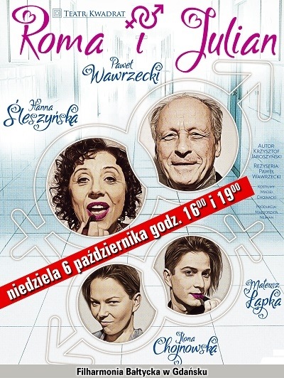 Spektakl Teatru Kwadrat "ROMA I JULIAN" obsada: Hanna Śleszyńska, Paweł Wawrzecki, Ilona Chojnowska, Mateusz Łapka Filharmonia Bałtycka w Gdańsku niedziela 6 października 2019 r - godz. 16.oo i 19.oo ceny biletów: 150,- 120,- 90,- 60,- zł Opis spektaklu: Czy on to już ON czy jeszcze ONA ? Czy w szalonych czasach chirurgi plastycznej i zabiegów in vitro można być ojcem i jednocześnie siostrą ? Współcześnie w Polsce: Klinika seksuologii. Na operację zmiany płci czeka para młodych ludzi. Roma chce zostać mężczyzną, zaś leżący w sąsiedniej sali Julian kobietą. Romę odwiedza o pokolenie od niej starszy mąż. Zapowiada rozwód i odebranie majątku. W tym samym czasie przy łóżku Juliana lamentuje matka wstrząśnięta decyzją syna. Tymczasem niespodziewanie...
