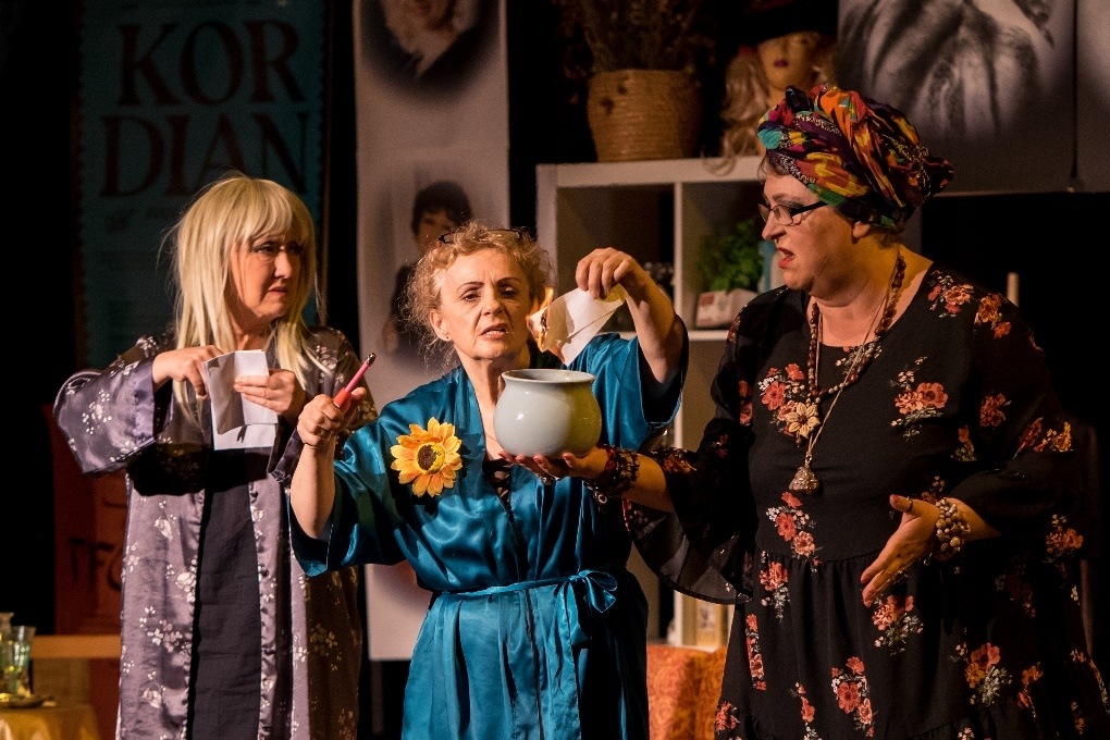 Teatralna garderoba trzech starych aktorek, życie płynie powoli, leniwie. 40 lat wspólnych prób, wspólnego życia, teatralnych plotek, powtarzania ról. Ludzie w małżeństwie tyle nie żyją! Trudno ocenić gdzie kończy się gra, a gdzie zaczyna życie. Lata świetności minęły, pozostały wspomnienia, niespełnione ambicje i stara szafa z przepoconymi kostiumami. Aż nagle w ten zakurzony świat wdziera się zbrodnia, seks i zioło i znowu krew zaczyna szybciej płynąć. Zapraszamy na premierę, dobra zabawa, dreszczyk emocji i chwila zadumy – gwarantowane./ Julita Banaśkiewicz /