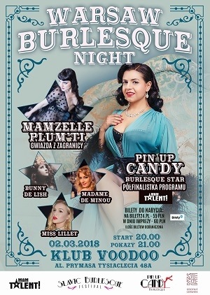 Warsaw Burlesque Night vol. 9 W styczniu przeniesiemy się na francuską scenę burleski i będziemy zajadać się bagietkami popijając czerwone wino. Plejada wspaniałych performerów pokaże Wam swoje najgorętsze pokazy: Burleska działa na Was rozgrzewająco, dlatego w marcowym wydaniu Warsaw Burlesque Night wystąpią niesamowite performerki: Pin Up Candy Mamzelle Plum’ti Bunny De Lish Madame de Minou Miss Lillet Zapraszamy na niezapomnianą noc z burleską... Start 20:00 Start pokazów 21:00 bilety 55 pln*******